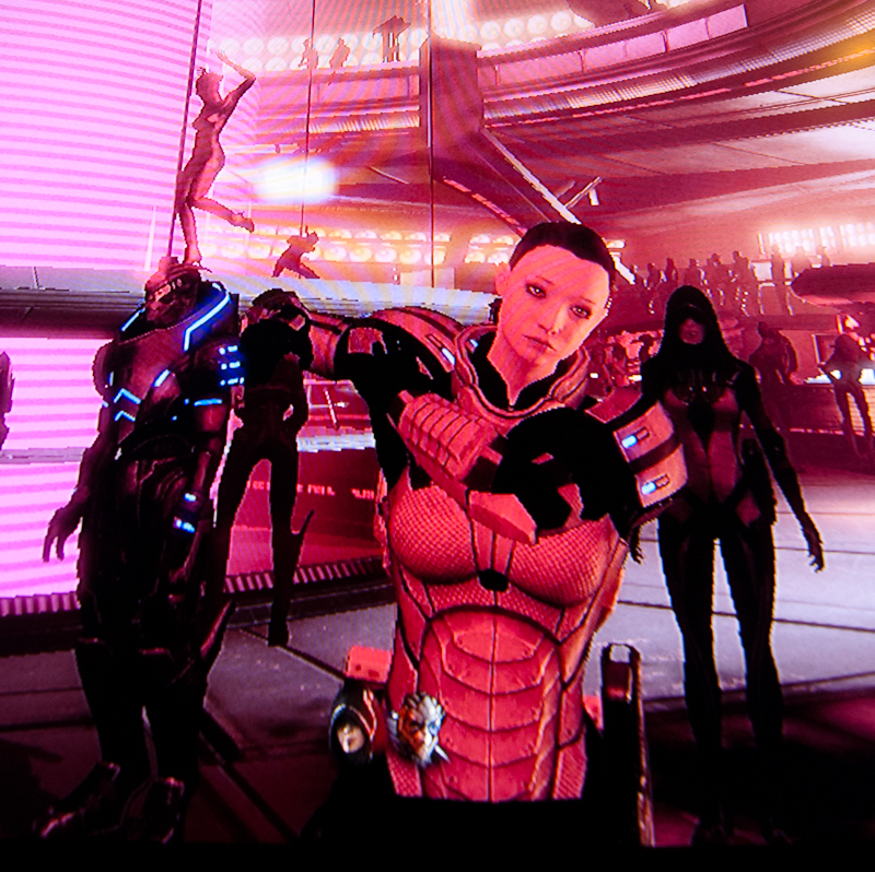 Commander Shepard Shepard. Tidigare Spectre. Här fångad på en bar tillsammans med sina tvivelaktiga kompanjoner Kasumi Goto och Garrus Vakarian. Hennes resa är ännu inte över, hon letar efter fler kompanjoner innan hon ska rädda universum. Igen.