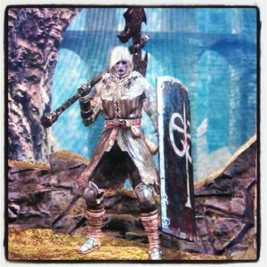 Slarva, level 108. Ex-pyromancer. Nu bestyckad med en Magic Black Iron Greatshield +5, en Black Knight Great Axe +5 och Wanderer-rustning +9.
